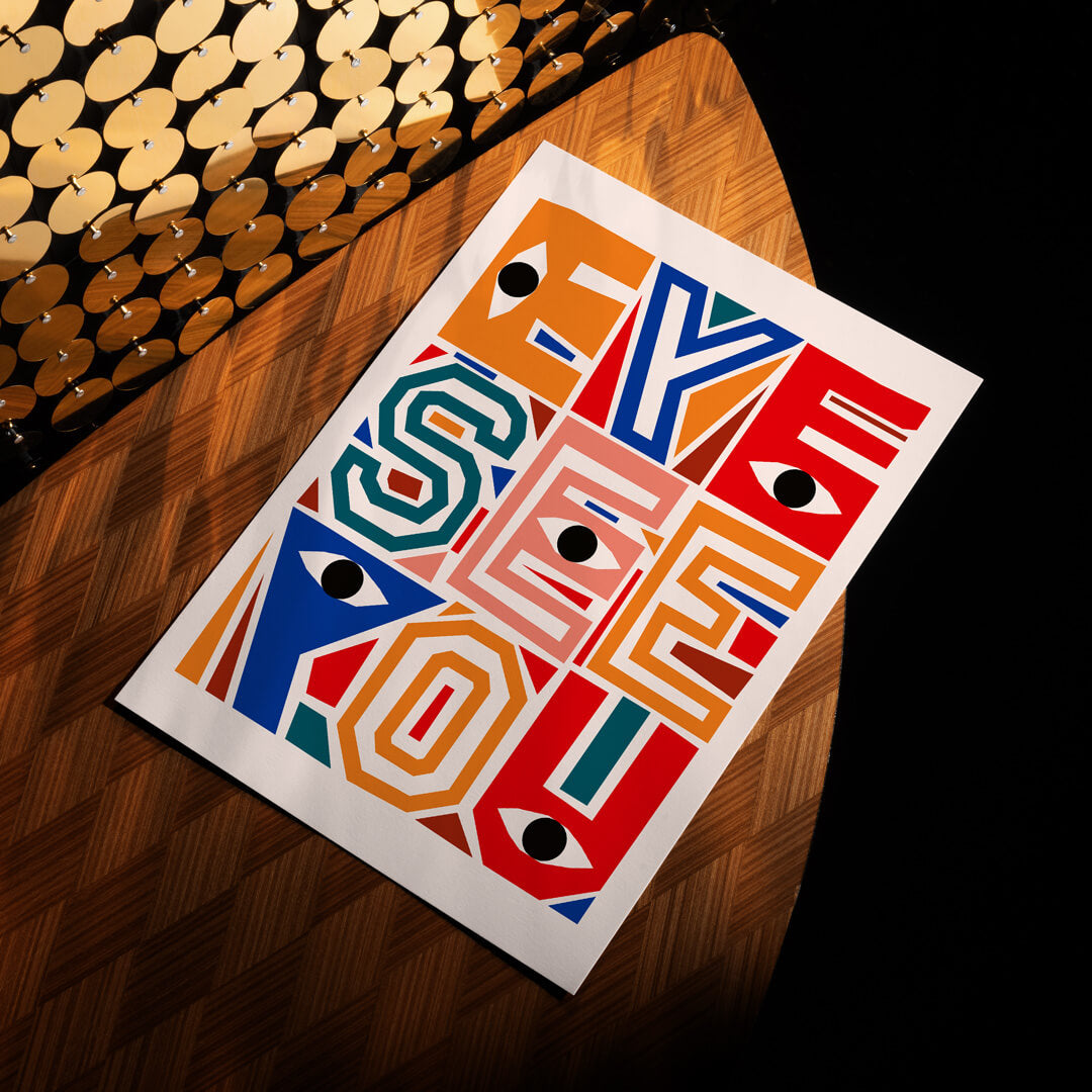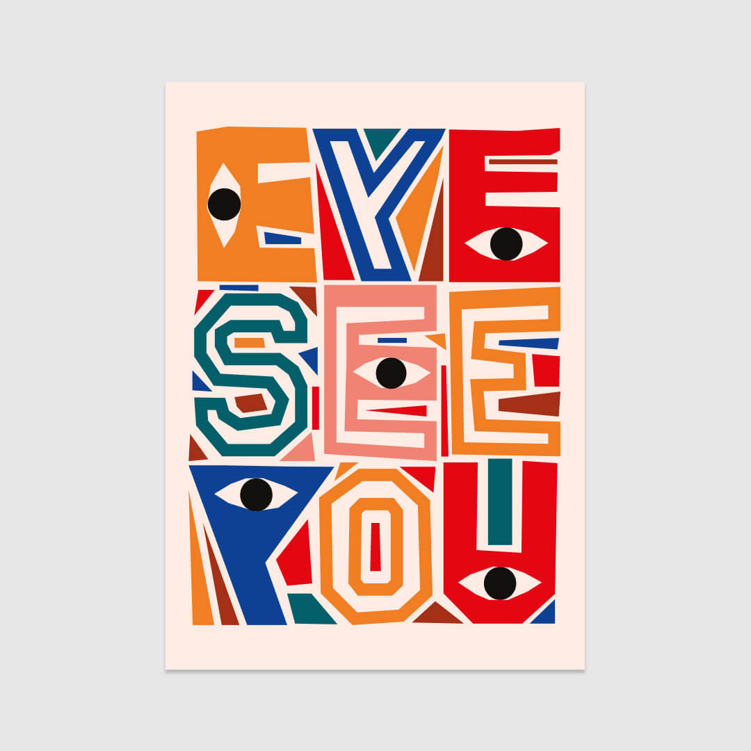 ‘Eye See You’ – A bold graphic statement from the Eyescapes Collection by Redy.Studio. This piece mixes playful typography with eye illustrations, creating a lively, vibrant pattern. Perfect for adding a pop of color and a touch of fun to any room.