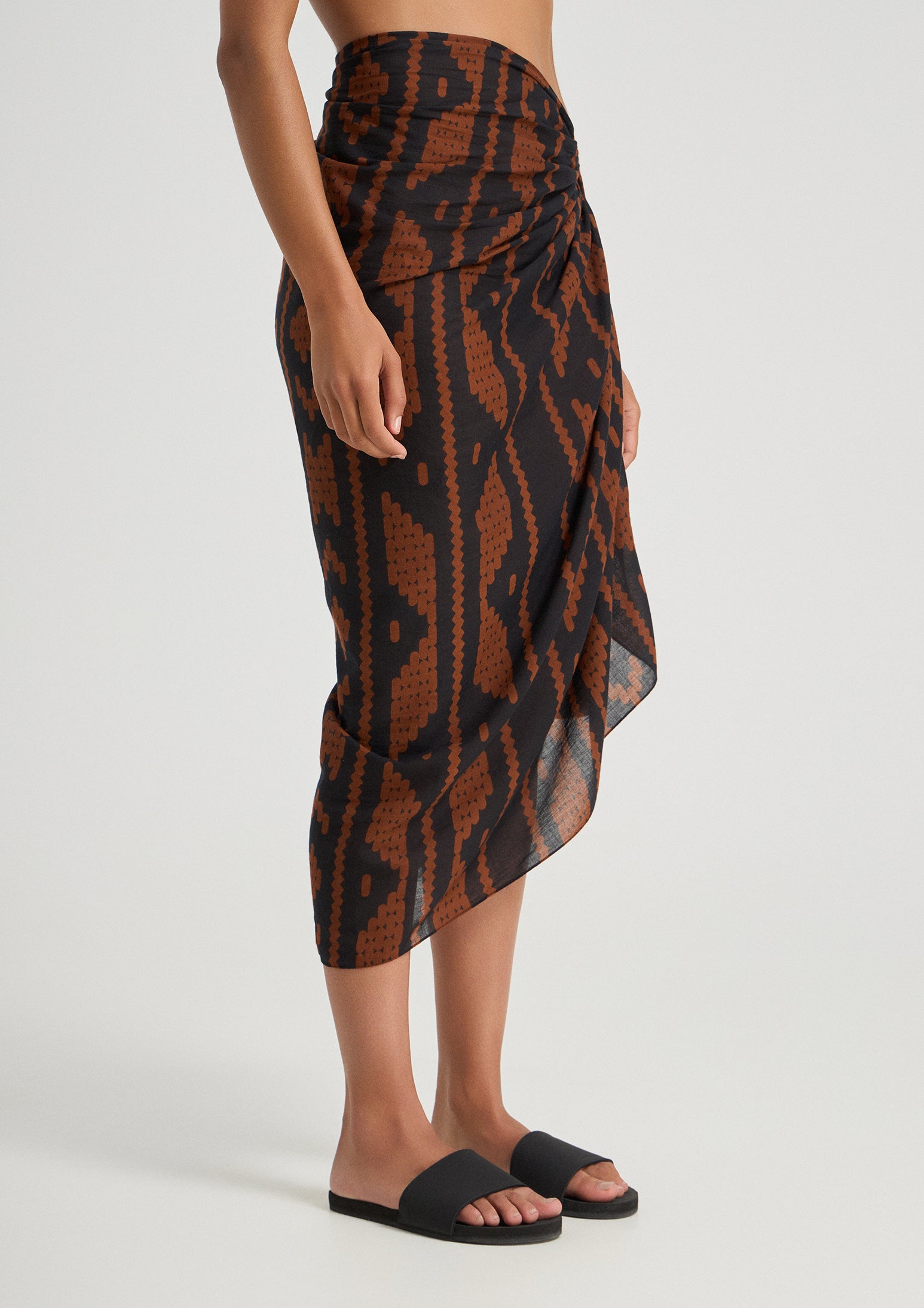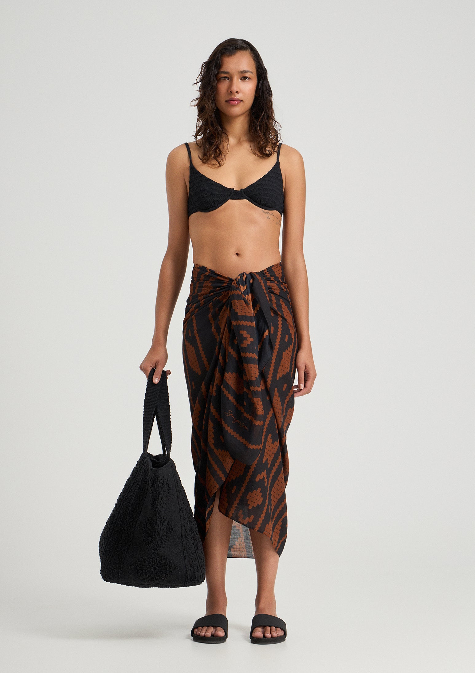 The Gabie Pareo, inspired by our bestselling Gabie tote bag, combines effortless style with functionality. Crafted from pure cotton and treated with a silicone wash for a smooth finish, it features an exclusive in-house geometric print in a striking burnt umber and black color combo. Versatile in design, it can be worn as a wrap or beach cover-up, making it a must-have for laid-back summer days. Perfectly complementing the Gabie bag, this pareo adds a chic, cohesive touch to your seasonal wardrobe.