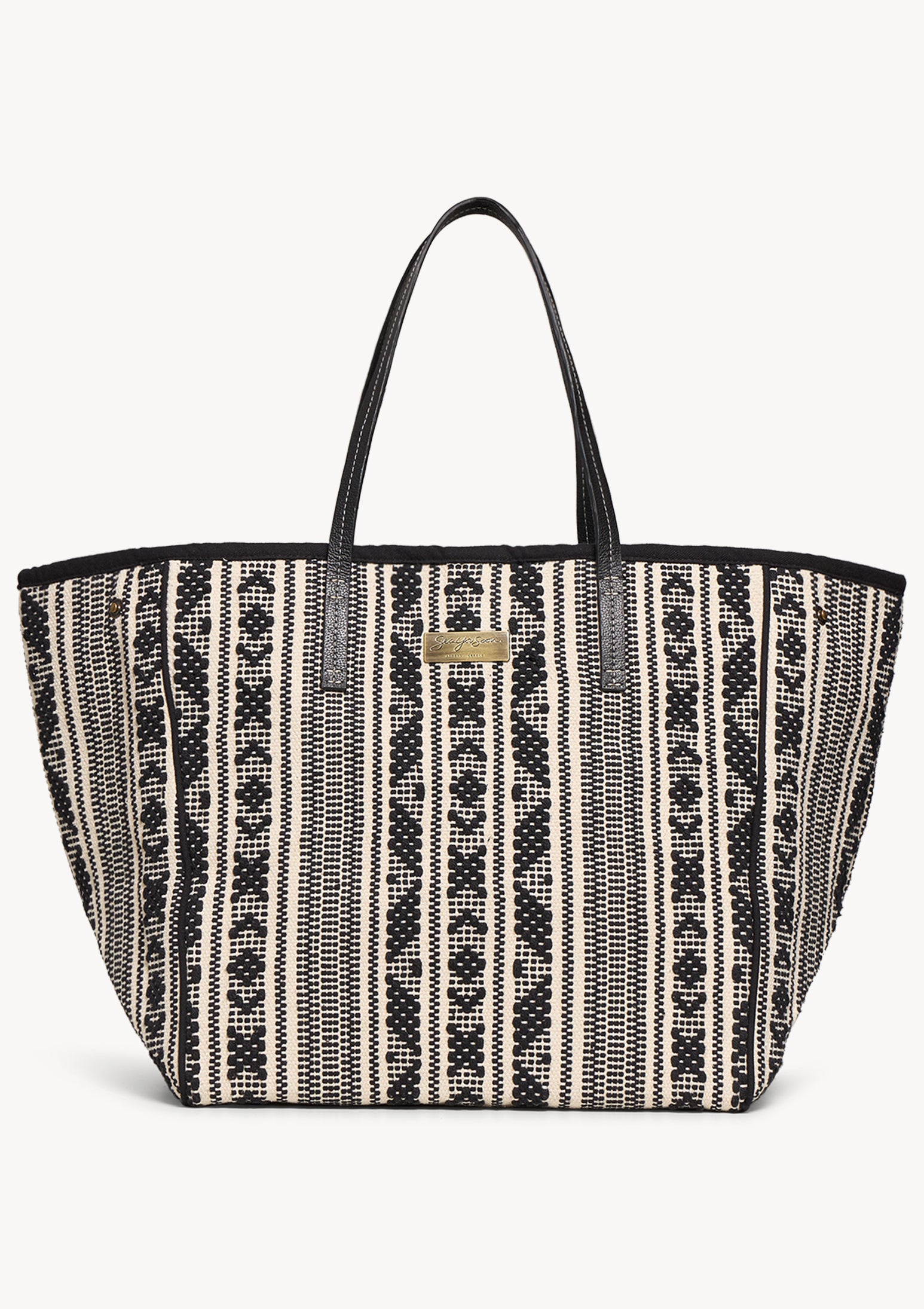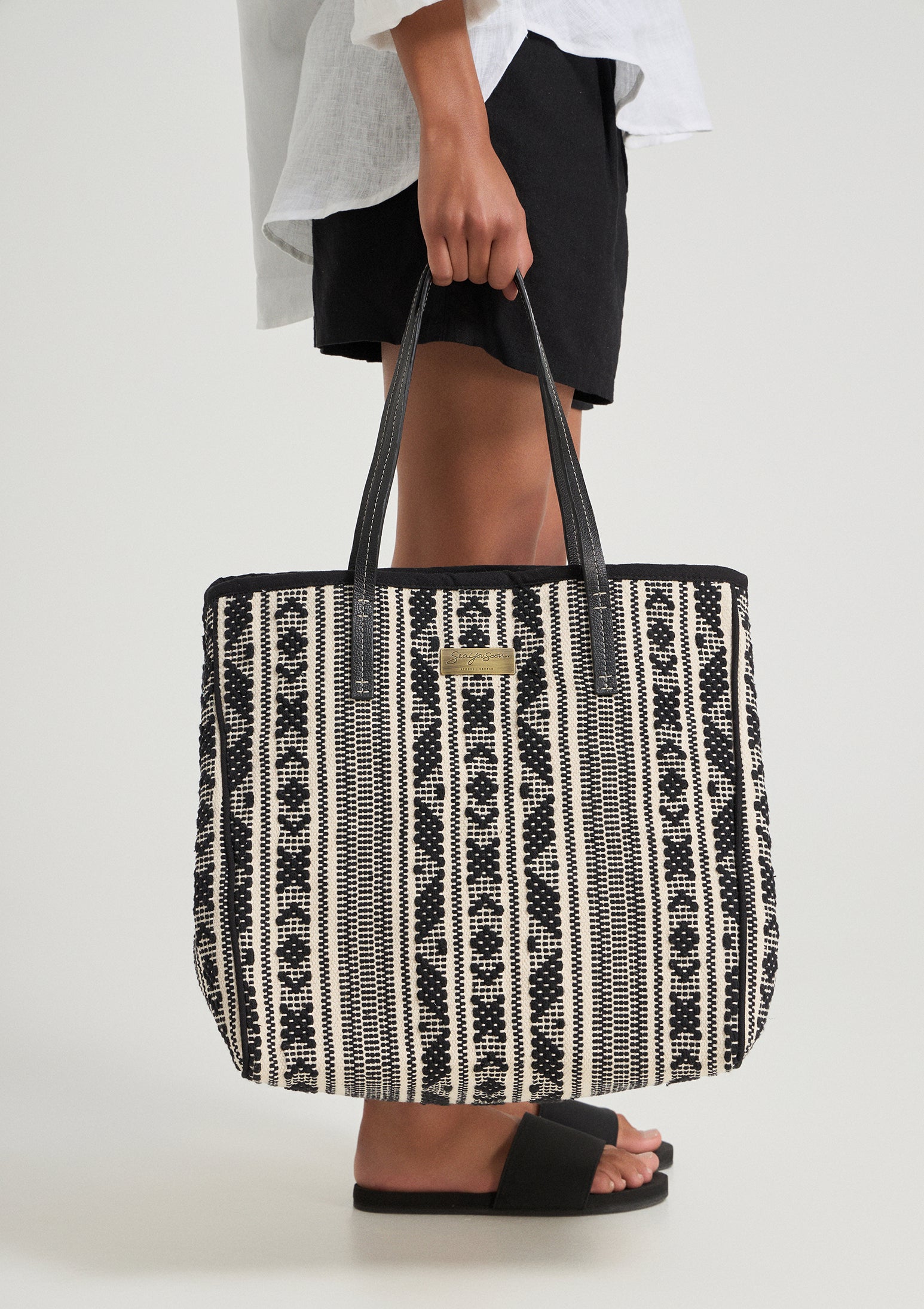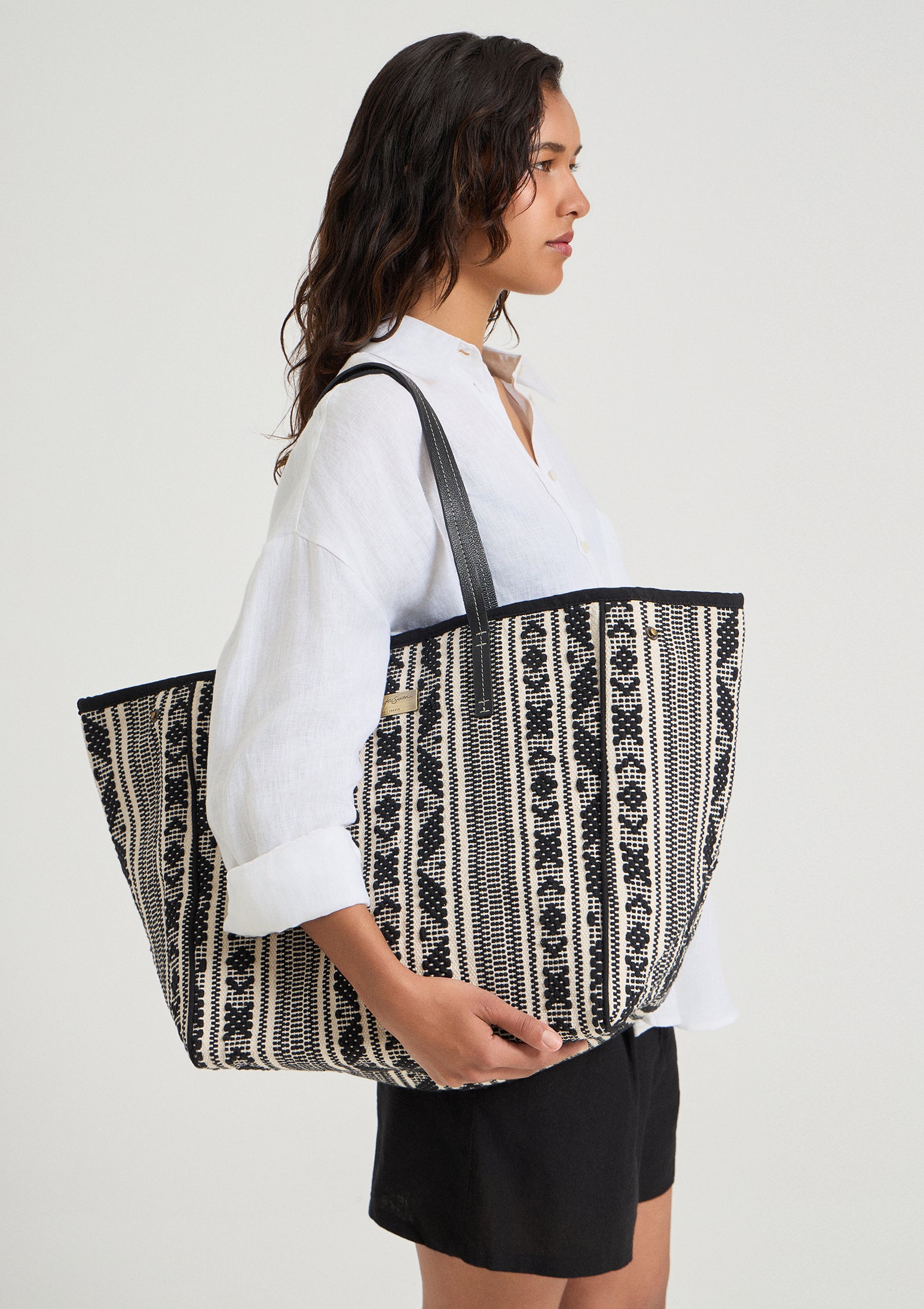 Introducing the Gabie Bag, your perfect summer companion. Made from durable hand-woven cotton and featuring an exclusive in-house diamond motif, it’s designed for both style and practicality. The large leather straps offer comfort, while the magnetic closure with a leather tab and side snap buttons keep everything secure. With a canvas-lined interior and a zipper-locked inner flap pocket for extra storage and a branded metal logo in antique brass, this bag is ideal for beach days, city strolls, or casual outings, effortlessly combining style and practicality.