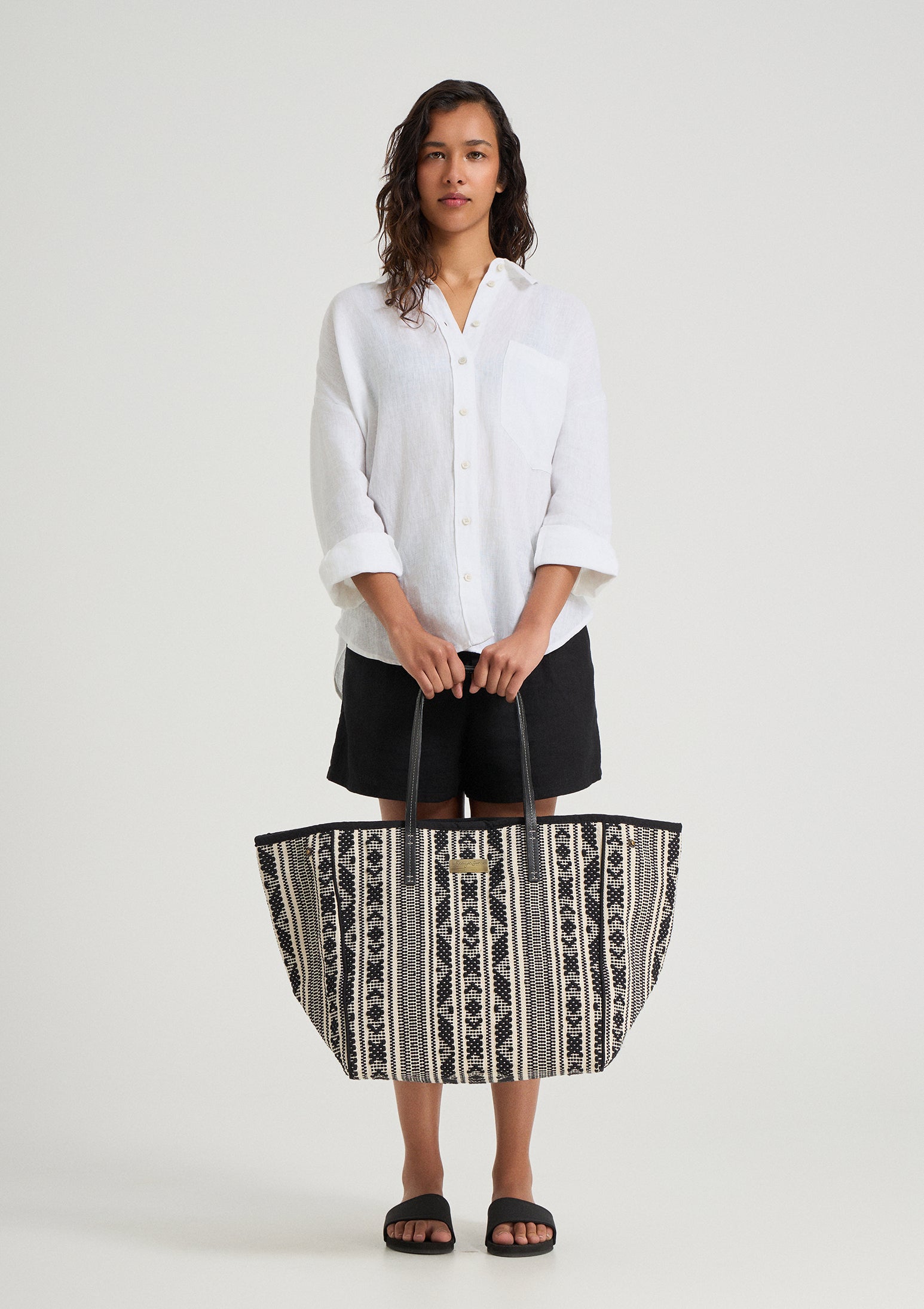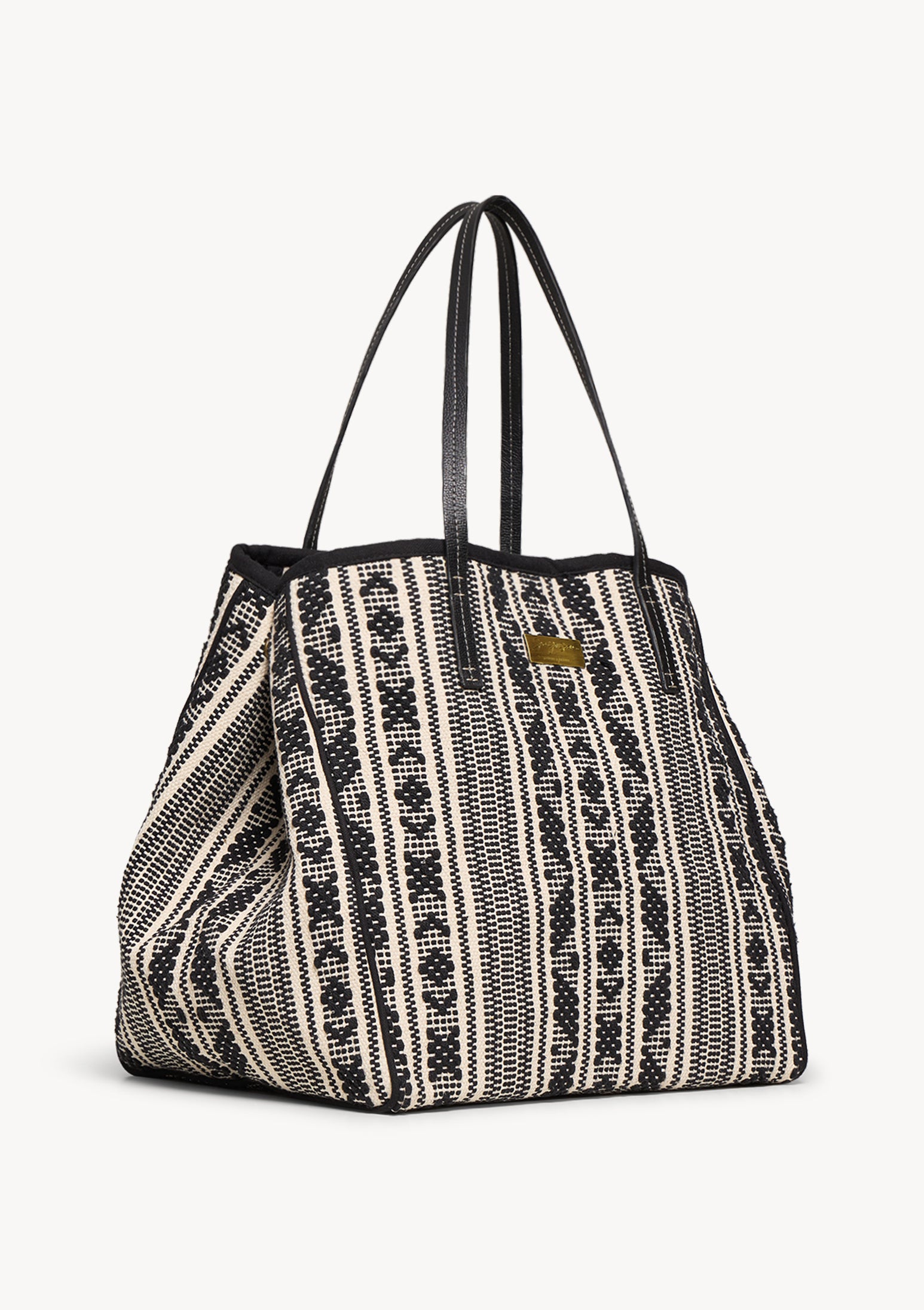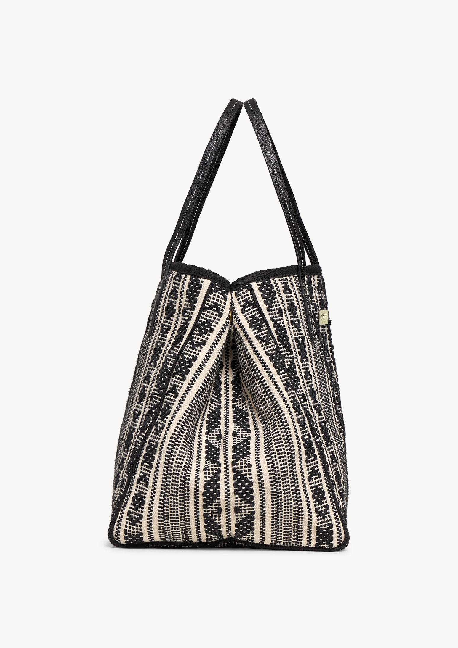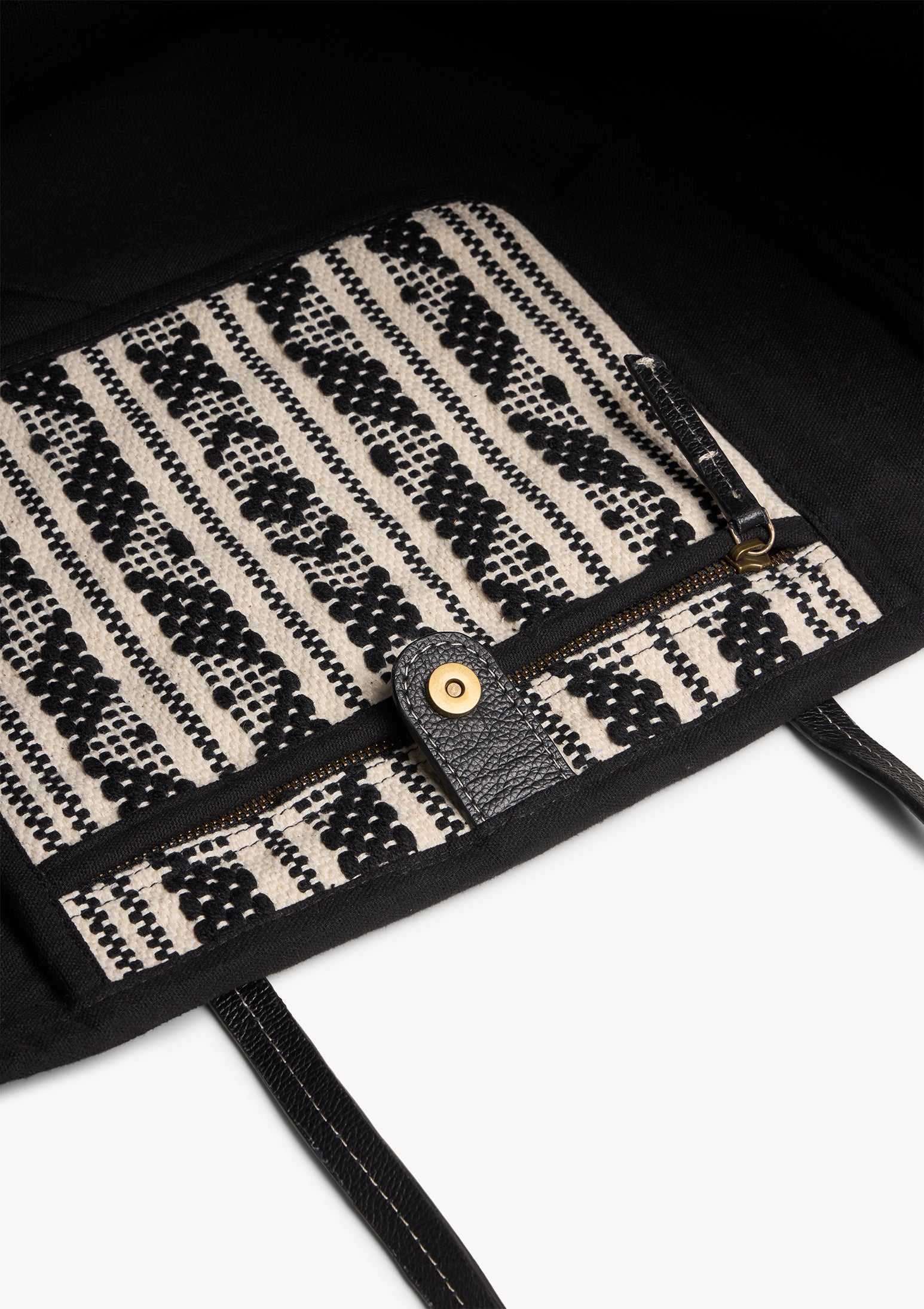 Introducing the Gabie Bag, your perfect summer companion. Made from durable hand-woven cotton and featuring an exclusive in-house diamond motif, it’s designed for both style and practicality. The large leather straps offer comfort, while the magnetic closure with a leather tab and side snap buttons keep everything secure. With a canvas-lined interior and a zipper-locked inner flap pocket for extra storage and a branded metal logo in antique brass, this bag is ideal for beach days, city strolls, or casual outings, effortlessly combining style and practicality.