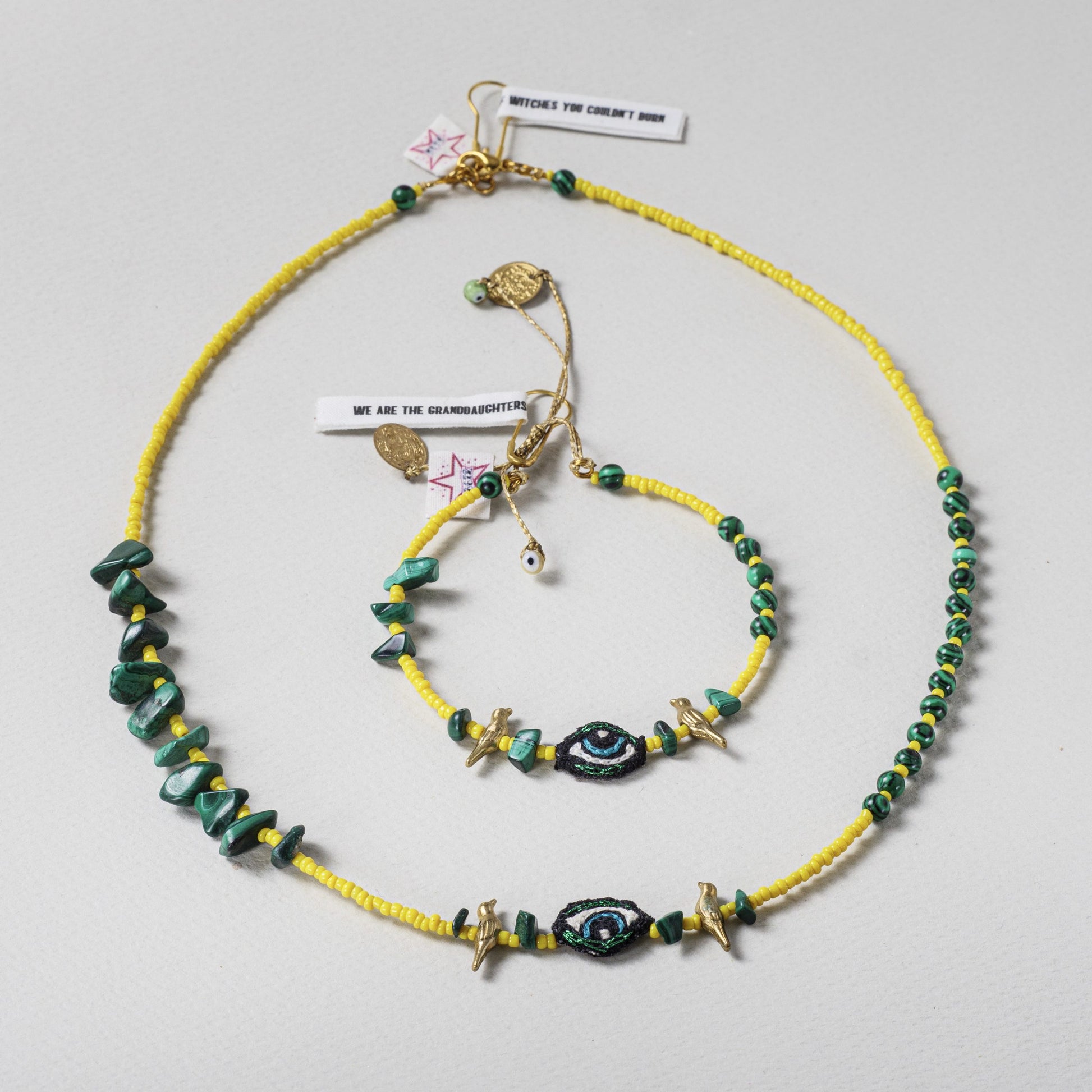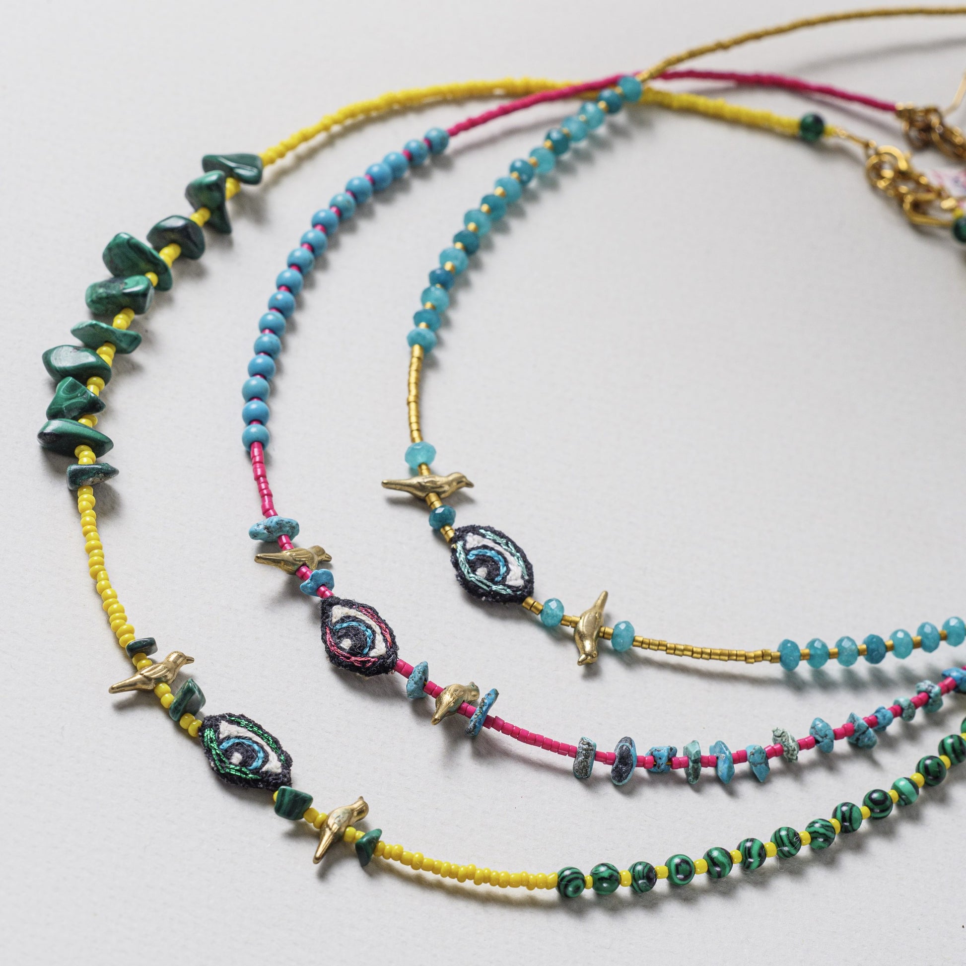 Chain – stitched eye necklace with brass birds and knotted wax cord with glass beads and gemstones in yellow, fuchsia, turquoise or gold colour.
