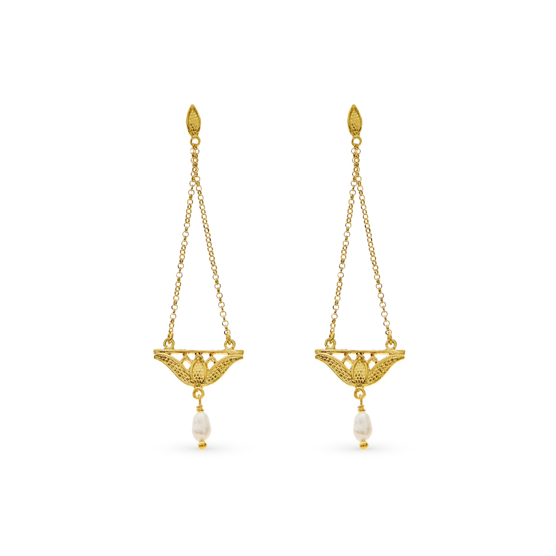 Handmade chandelier earrings in sterling silver 925, gold-plated in 24K with elements of Lahouri textile design and fresh water pearls
