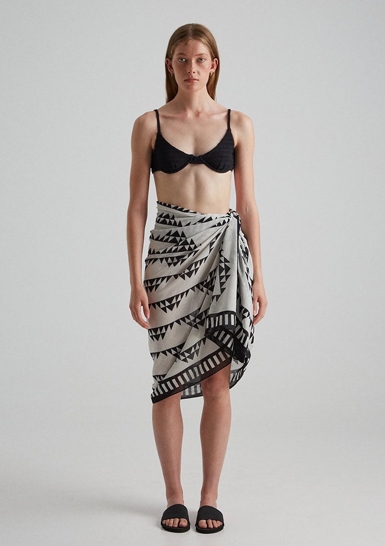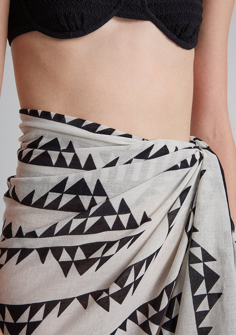 Meet our Muro pareo, a summer essential, made from ultra-soft cotton, flaunting an exclusive in-house print with a triangle spiral motif in black and white. Wrap it around your waist for instant beach vibes, drape it when you need sun protection for your shoulders, or style a Mini Top for laid-back charm. With endless possibilities, this classic rectangular pareo is your ultimate choice for coastal comfort or a leisurely stroll through the streets of the coolest retreats.