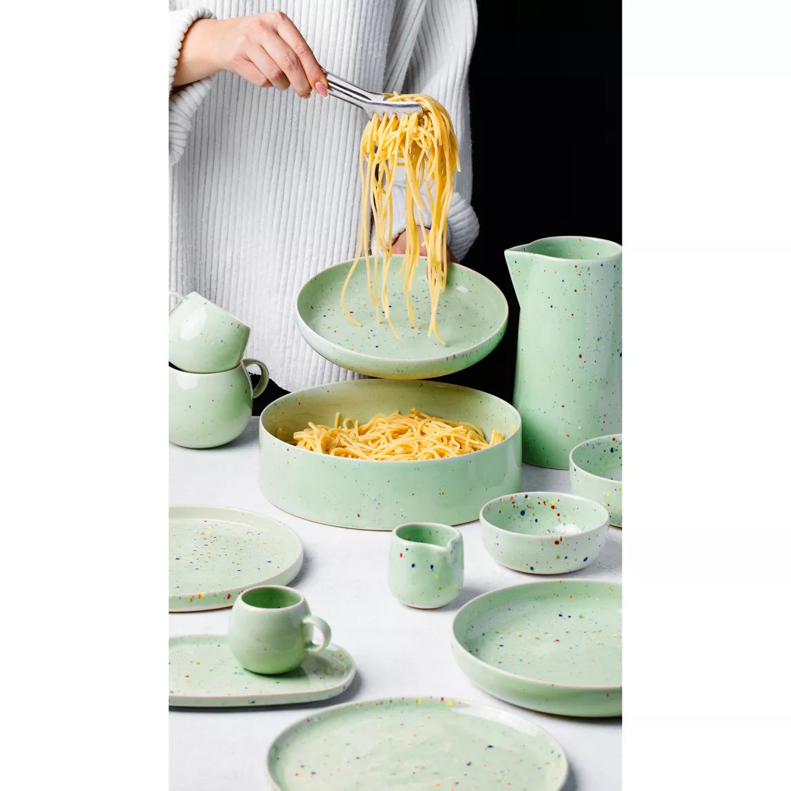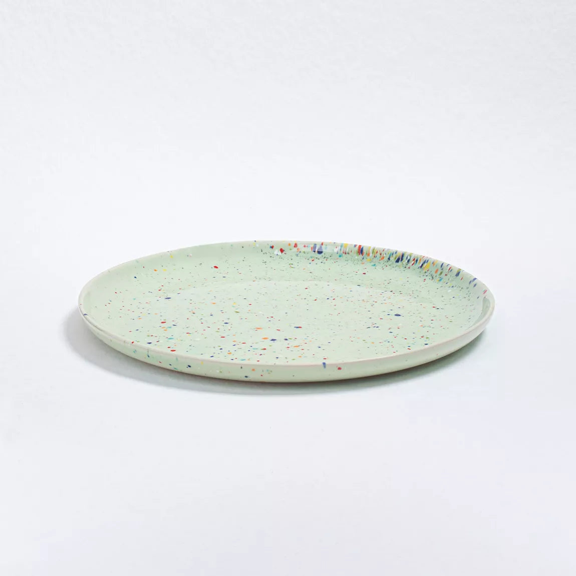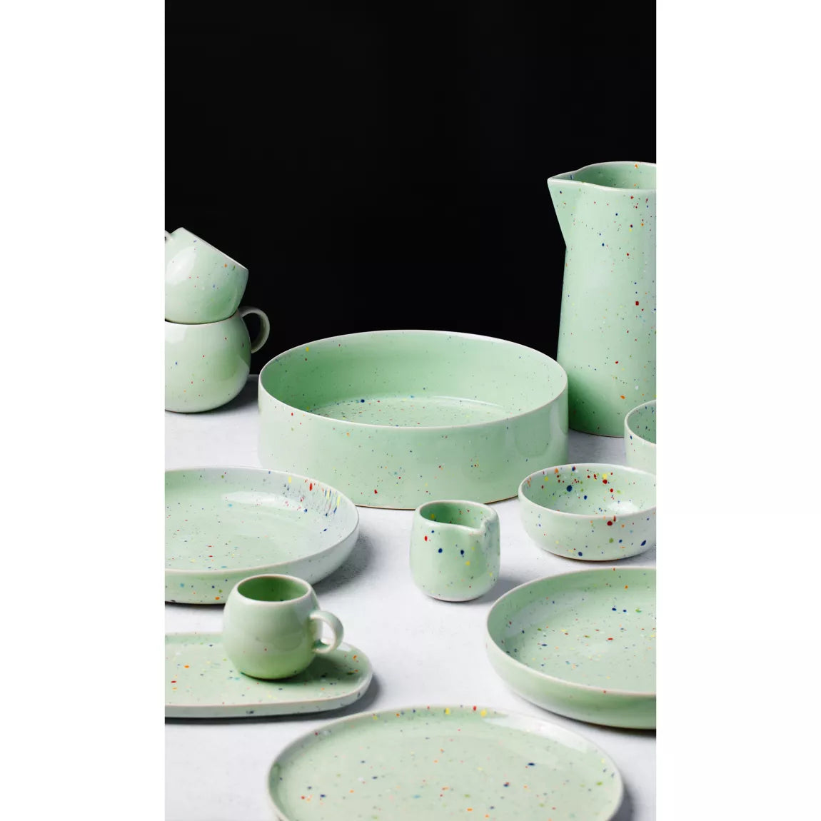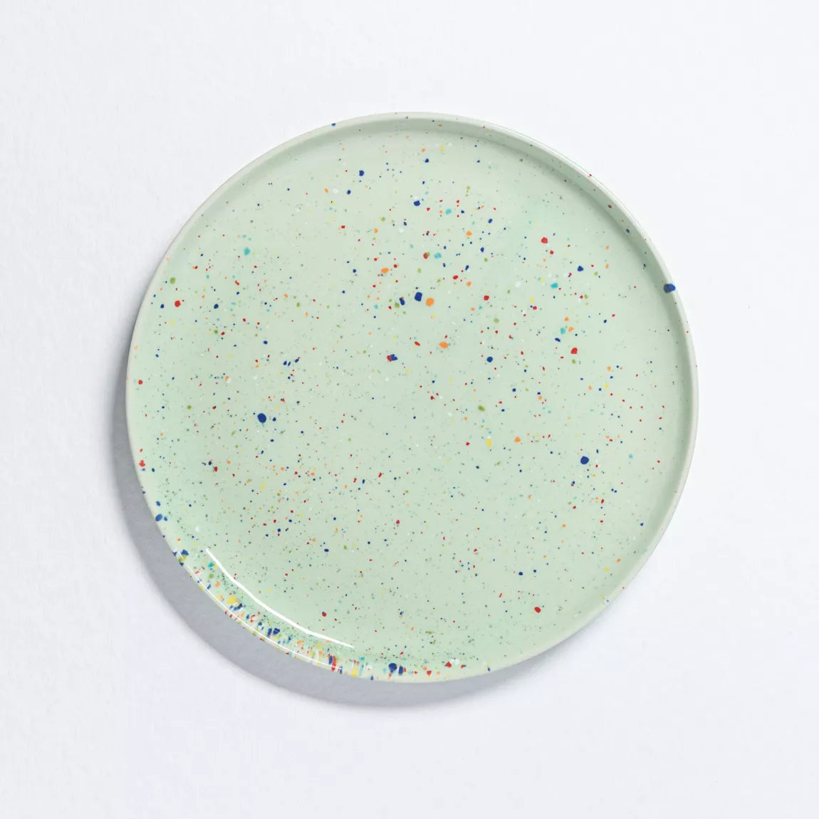 Our Party Collection features a special type of glaze that may exhibit areas where speckles become diffused due to the glass's reactive nature during processing. We find these unique, unpredictable variations to be the most beautiful aspect of the glaze.