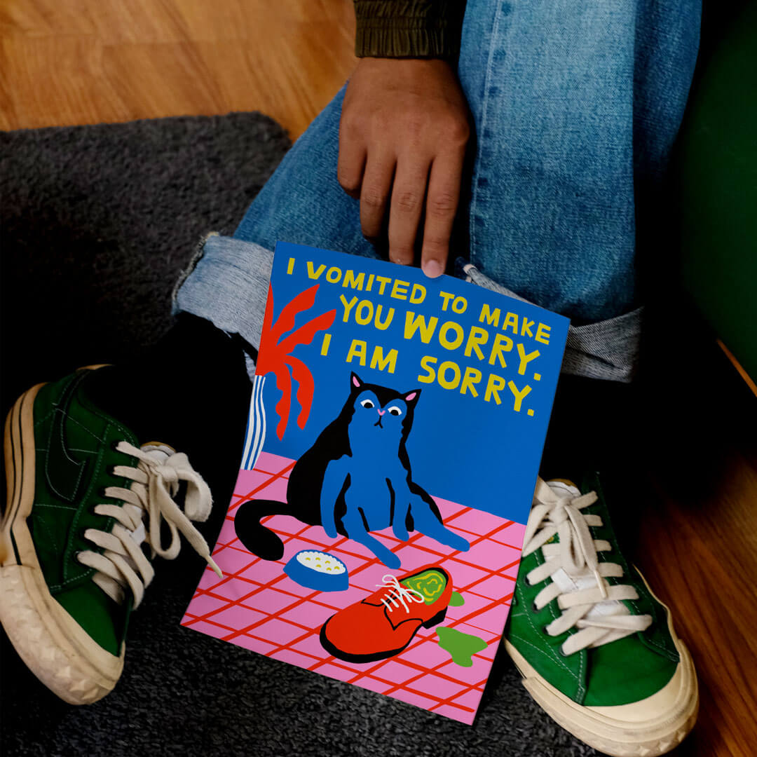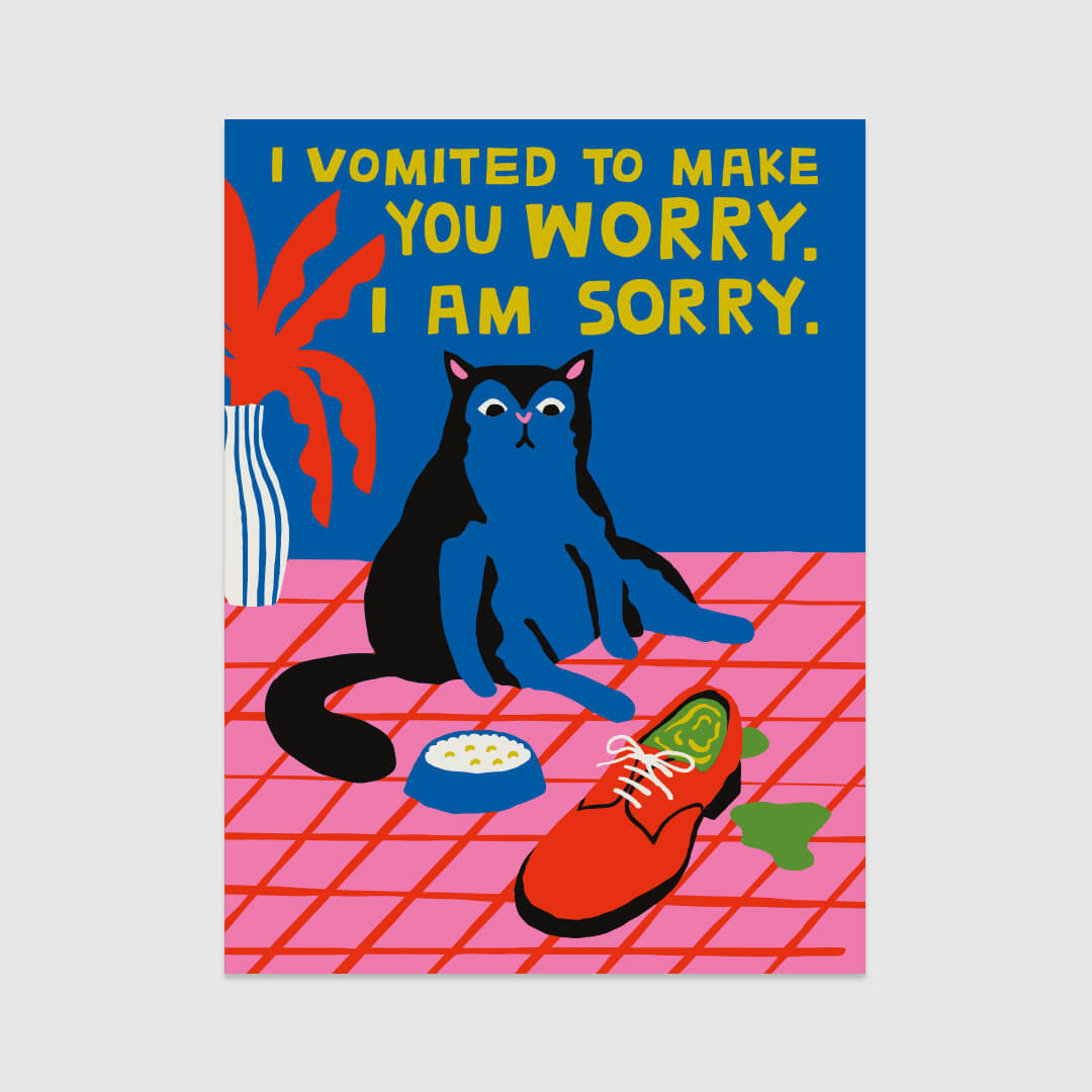 Step into the comical world of feline apologies with our ‘Vomited’ poster, a whimsical addition to our ‘ACAB – All Cats Are Beautiful’ series! This mischievous cat, standing proudly in front of a regrettably expelled shoe, confesses, ‘I vomited to make you worry. I am sorry.’ Embrace the quirks and unexpected surprises that cats bring to our lives. Add a touch of humor to your decor, and remember that, no matter what, ‘All Cats Are Beautiful.’